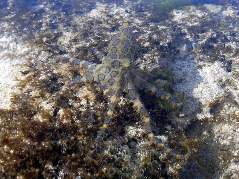 The blue-ringed octopus, despite its small size, carries enough venom to kill twenty-six adult humans within minutes. Their bites are tiny and often painless, with many victims not realizing they have been envenomated until respiratory depression and paralysis start to set in. No blue-ringed octopus antivenom is available yet, making it one of the deadliest reef inhabitants in the ocean.