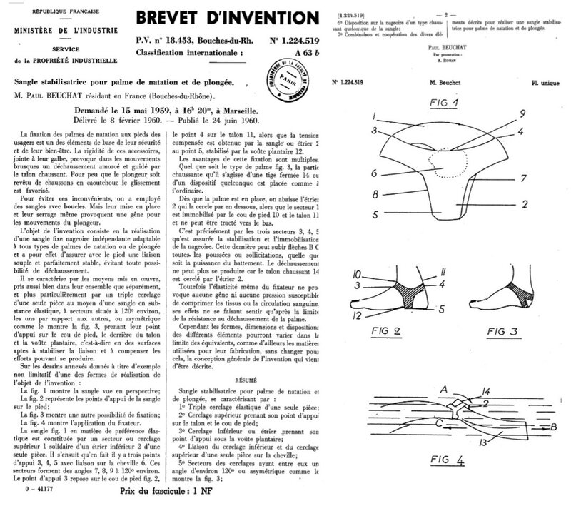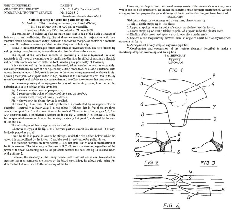 First known as "fixe-palmes" ("fin fixers"), these three-way straps were patented by Paul Beuchat of French diving equipment manufacturer Beuchat back in 1960. The patent is reproduced below in the original French and in a rough English translation I made: