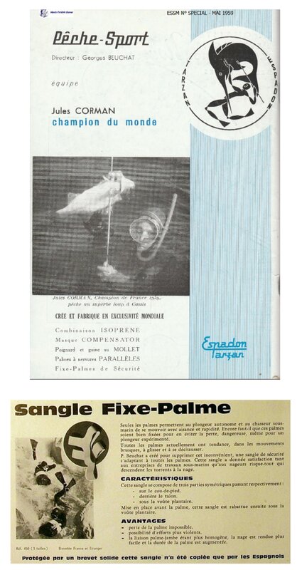 Two Beuchat advertisements. The first is dated 1959, revealing that the device was on sale a year before the publication of the patent. The second from 1961 illustrates the fixe-palmes in action in choppy waters, maintaining closed-heel fins on feet.