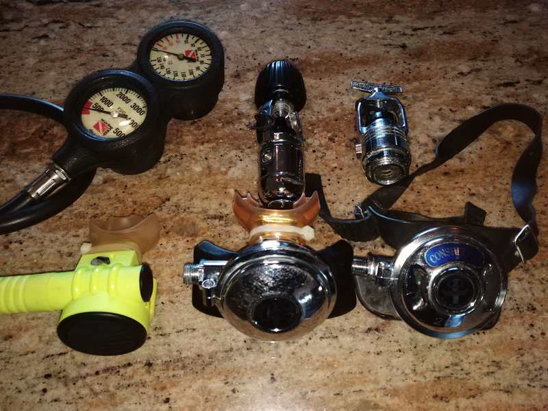 So, an "acquaintance,:" let's call him, owed me $25 bucks for a welding job I did. He paid in a couple of old scuba regs. I don't know exactly what I've got, and what it's worth. I WILL be using one of the second stages for the octo on my Kraken, replacing a random Hog second I had floating around. The first stages and the other second will be for sale. I'm gonna save the Micro just because it's cool, even though I doubt I will ever use it for anything.