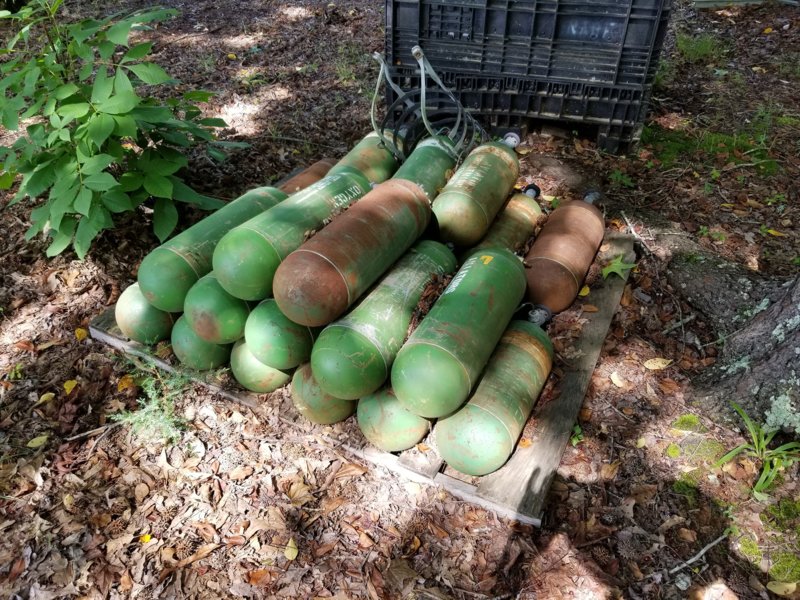 OK, silly question here, why the wire? Is that to control shrapnel in the event that they get perforated?Here is a pallet of aviation O2 cylinders recently removed from scrapped Navy Lockheed SP 2-H antisubmarine patrol aircraft. I have many hours as a crewman on these aircraft. Notice they are wire wrapped, the wire was removed when used for diving. Dr. Sam hit the nail on the head.
