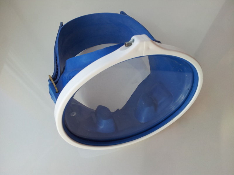 J. SPINE «НИМФА» (Nymph) mask (Made in Russia). Blue rubber body fitted with clear oval tempered-glass lens, white plastic rim, ear-clearing bosses and double head strap.