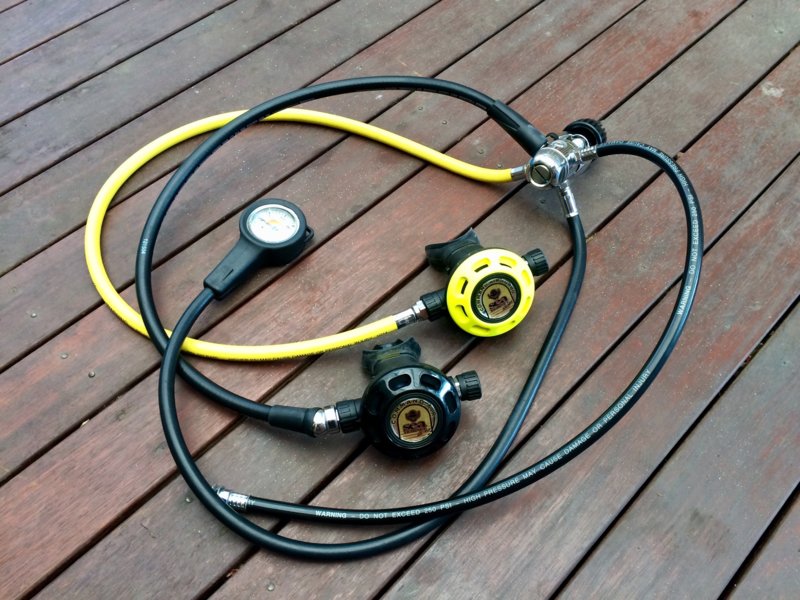 Conshelf 21 first with Sea Hornet Command Air seconds... primary with an Atomic Aquatics swivel hose. Scubapro brass and glass SPG in BAR.