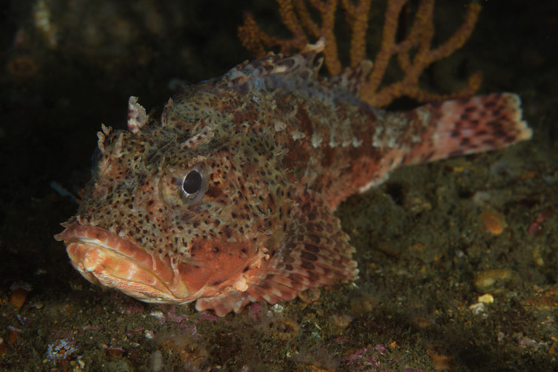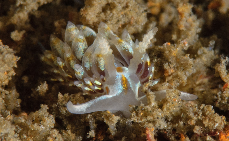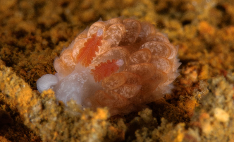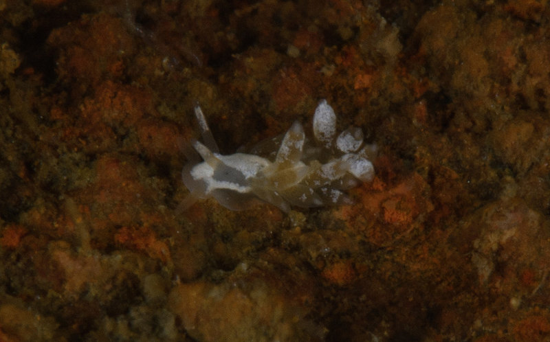 Much of the marine life has disappeared from the barge. We spent nearly an hour looking under every piece of rust and garden brick and came away with a few photos. Merry found a small piece of rust that had a few different species of nudibranchs including a tiny white dot that became a Trinchesia albocrusta with a lot of magnification. The water has warmed since our last dive to 55° with no surge.
