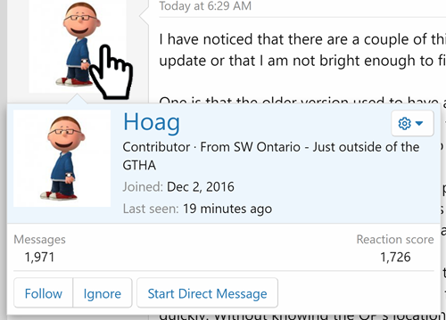 Thank you. Like I said in my post maybe "I am not bright enough to figure out where they are."This was variable before the upgrade depending on how the member's account was configured. I hadn't noticed that change but it "might" be because a mouseover on the avatar pops the profile summary like in this image. Note that the location (if specified) is included.