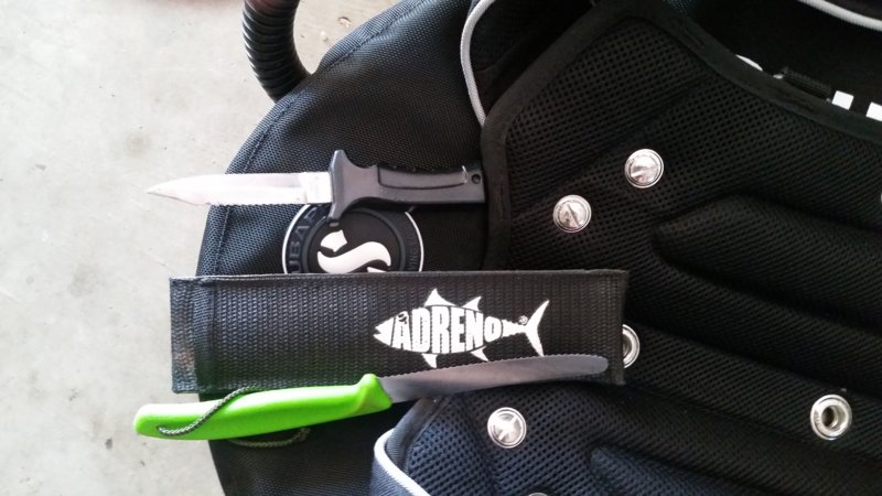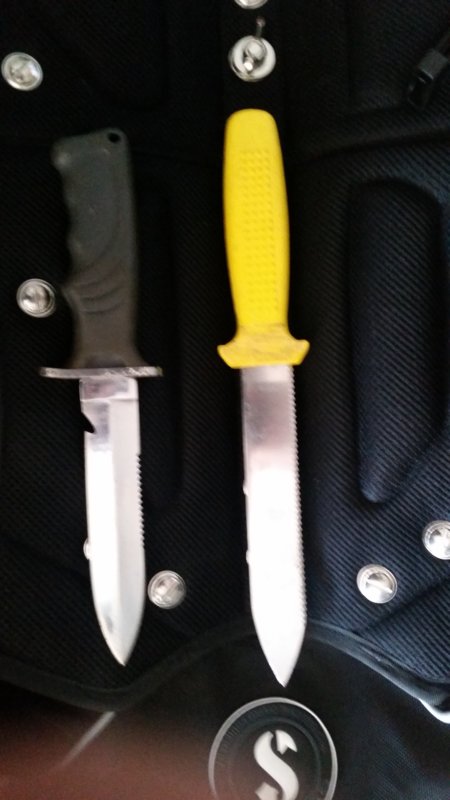 The 2 at the top are what is use now, victorinox knife [from the kitchen] on my belt , the small one in a sheath on my inflator hose, the large ones are only 2 of some I have not used in many years, sold 2 large knifes last week on ebay.