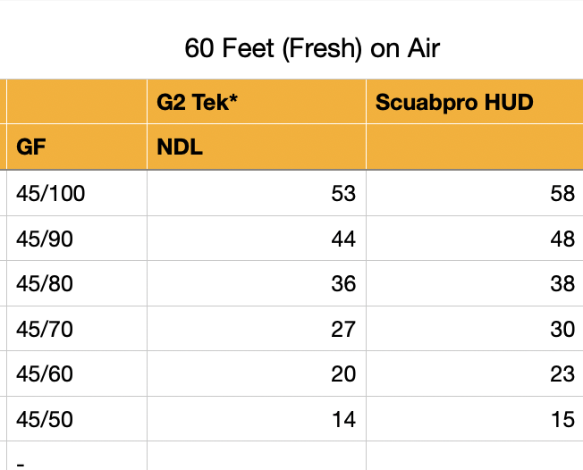 I’m running GF 40/80 on the HUD and MB 0 on the G2, my diving doesn’t normally get anywhere near NDL very often at least not locally. I find the HUD incredibly nice for navigation.