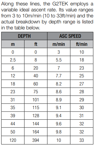 I don't see it documented that the G2 TEK uses the variable ascent rates in its deco/stop calculations...I guess that can be implied, but it is never stated as such that I can find. There is this additional Scubapro Gem...