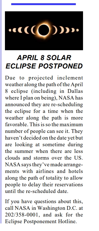 The weather looks just fine the day before. If this wasn't a LEAP YEAR we'd all have clear skies !!!As long as the are rescheduling it anyway, a weekend day would be preferable. Thanks.