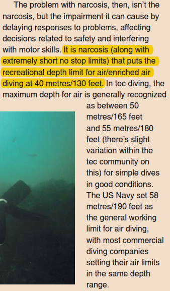 So this section is discussing narcosisis, not all the reasons that the rec limit ended up being 130 ft.