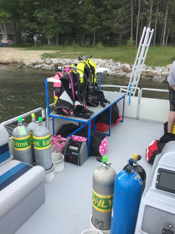28' pontoon, will carry 6 sets of gear with 2 tanks each comfortably, have had up to 8 sets of gear also though. All cold water here in MI. benches are 2 6' strips of plastic dock pieces bolted down on custom welded frame with tanks holders. Lots of room to sit down and strap into gear.