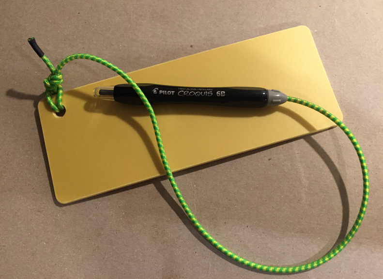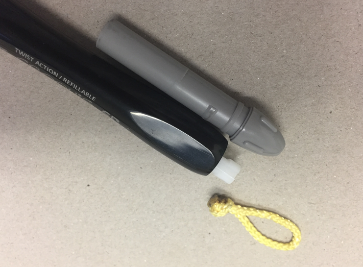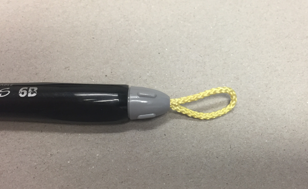 You can put a small loop of #18 -- or a whole tether. The only tricky bit is that the lead holder (white part) comes up into the cap (gray part) at the point of maximum retraction. So, if you retract fully and have a big knot in there, retracting will pop the cap right off. If you haven't already used some lead, you may want to use some or snip some off so you can retract.