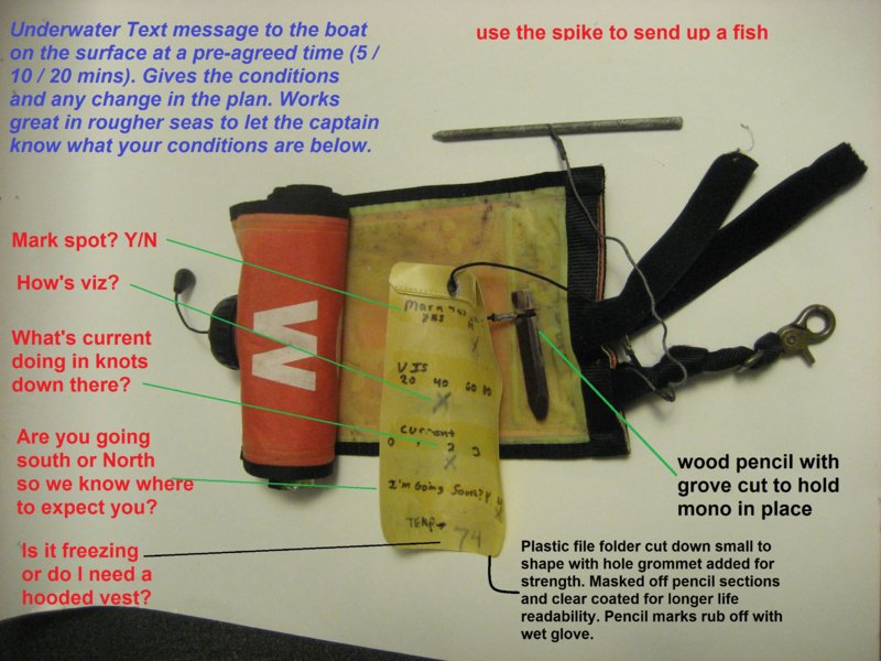 A blank white slate with a note written on it takes too long and the captain may get it wrong. So I have a pre-made form that just has "Check Marks" for everything they want to know. I can mark the boxes in less than 10 seconds and shoot the SMB within the first 60 seconds of hitting the bottom.