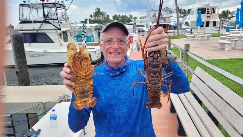 I don't catch many of these,,, but in the picture below is a big slipper lobster compared with the normal Florida spiny lobster. They don't move during the daytime and just look like a small rock near the ledge. But the outline of the curved ears makes it easier to spot since divers hunt by shape and not by color underwater. In side by side, Blind Taste test sampling, many people say they taste flaky'er & better than spiny lobsters without being told prior which is which.