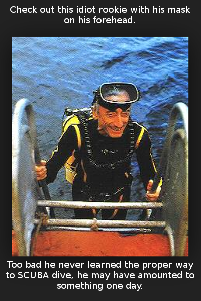 I was out this summer diving with a class. We had a new "assistant instructor". He didn't know I sometimes assist with the rescue course and I go dive with the class. We'd never met. So I go out with the OW class to dive just for the free boat ride while they're doing their class stuff. He sees me in about nipple-deep water with my mask on my forehead and thinks I'm a student in his class and his "I'm gonna be an instructor" Alpha male thing kicks in...in his best "drill sergeant" voice he yells..."Hey you! <pointing finger at me> You with the mask on your forehead! Get that mask of your forehead! Once you're certified then you can wear it any way you want to!"